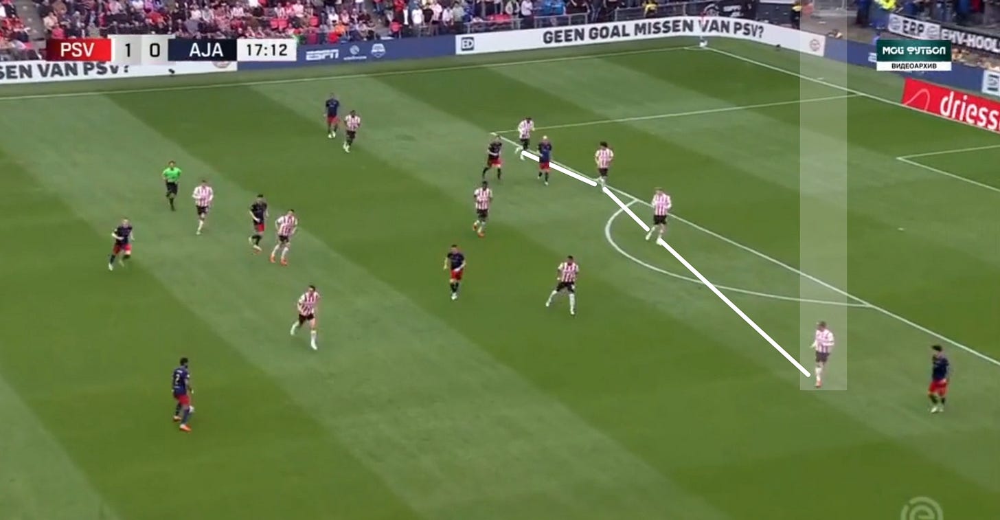 Simons performs his defensive tasks to the fullest, as his team needed him in the defensive situation while Ajax attacked, he returns to the defense for help through pressure, or by tackling, or even to increase the number, so that in some shots he is inside the penalty area.
